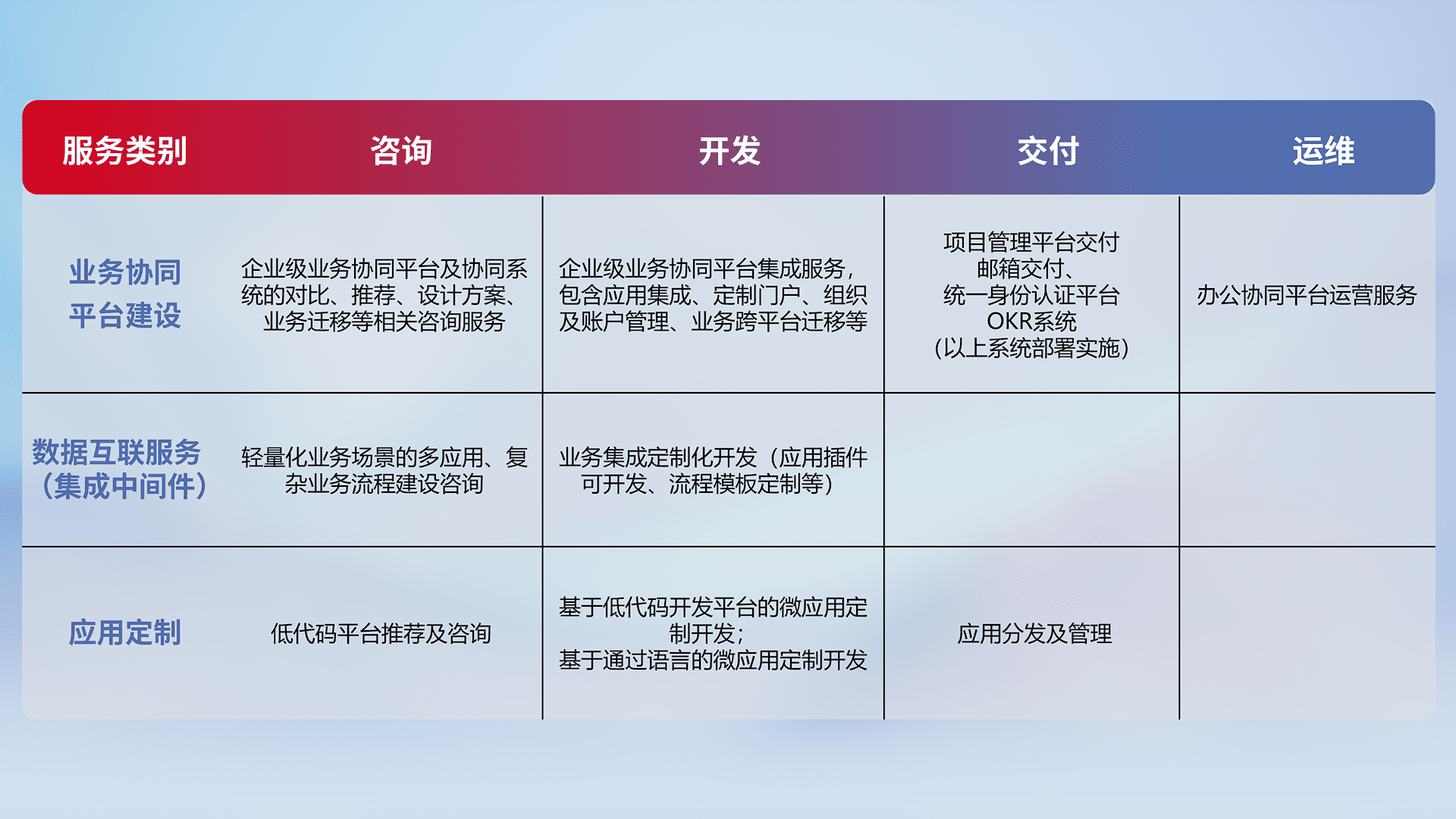 针对钉钉、、、企微、、、、IDaas等平台级产品提供产品的规划、、、、方案、、交付、、、、定制化开发等服务,,,,实现如统一协同办公、、、智能客户服务、、、混合会议管理、、、智能数据查询、、等业务场景,,实现数字化转型。。。。
